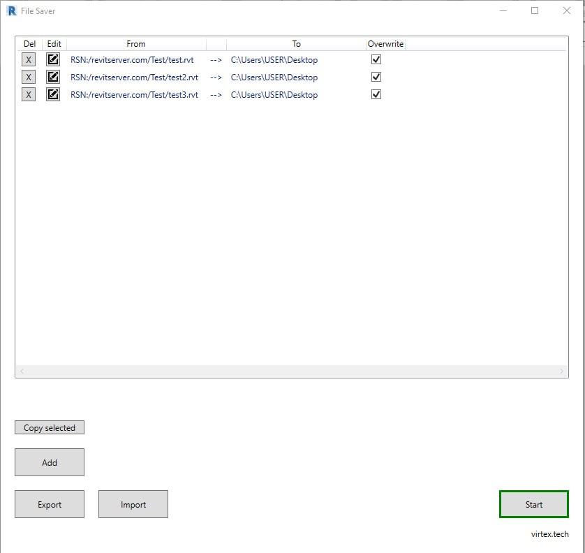If you need to download files from the Revit Server to send to contractors, the program allows you to select the required files and folders, specify a save path, and initiate copying with a single click of the “Start” button. This saves time and ensures accurate data transfer.